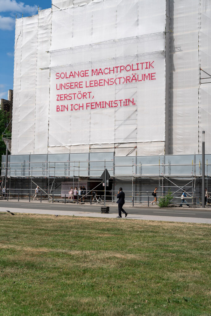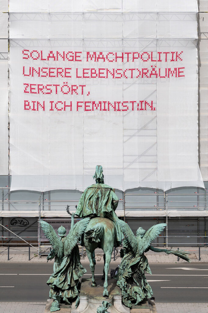 Unser Werkzeug ist ein ca. zwei- bis vierhundert Quadratmeter großes Kunstwerk – ein handbesticktes Staubschutznetz auf Baustellen. […] Ein Satz, der mit „Solange“ beginnt und mit „bin ich Feminist:in“ endet, wird mit pinkem Tüll im Kreuzstich großformatig auf Staubschutznetze gestickt und an Baugerüste montiert. Das Spannungsfeld entsteht aus der Dynamik zwischen traditionell weiblich konnotiertem Handwerk und Männer-dominierter Baustelle.